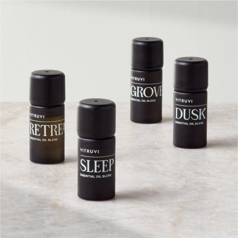 Perfect for taking a pause, Vitruvi’s Rest Kit includes four calming essential oil blends: soft Sleep, restorative Retreat, warm Dusk and woodsy Grove.