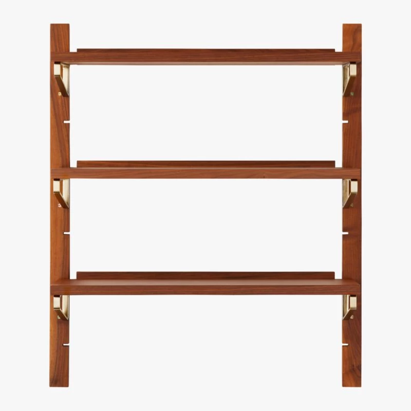 Designed by Leonhard Pfeifer, warm walnut shelves float the wall in modular design. Champagne metal shelf brackets can be slotted at varying heights for the ultimate in flexibility and customization. Need more storage? Just add more single shelves or upright pieces (sold separately). Learn about Leonhard Pfeifer on our blog. CB2 exclusive.