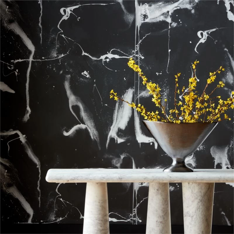 Derived from a free-form watercolor painting, wallpaper showcases a striking abstract painting style. Designed and printed in the United Kingdom, sinuous lines of black and white exhibit a hybrid style of Venetian grandeur fused with urban painting aesthetics. Wallpaper comes in easy-to-install sequential panels that transform modern interiors. CB2 exclusive.